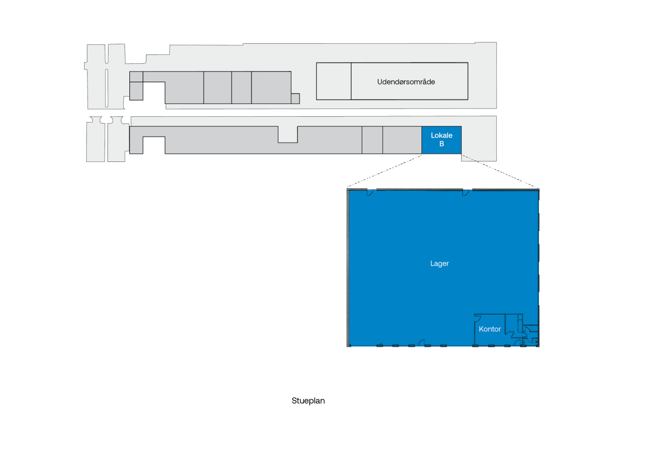 | Lokale B - lager og kontor | m²:694 | Månedlig leje:45.399 kr. | Månedlige drifts- og varmeudgifter:16.050 kr. |