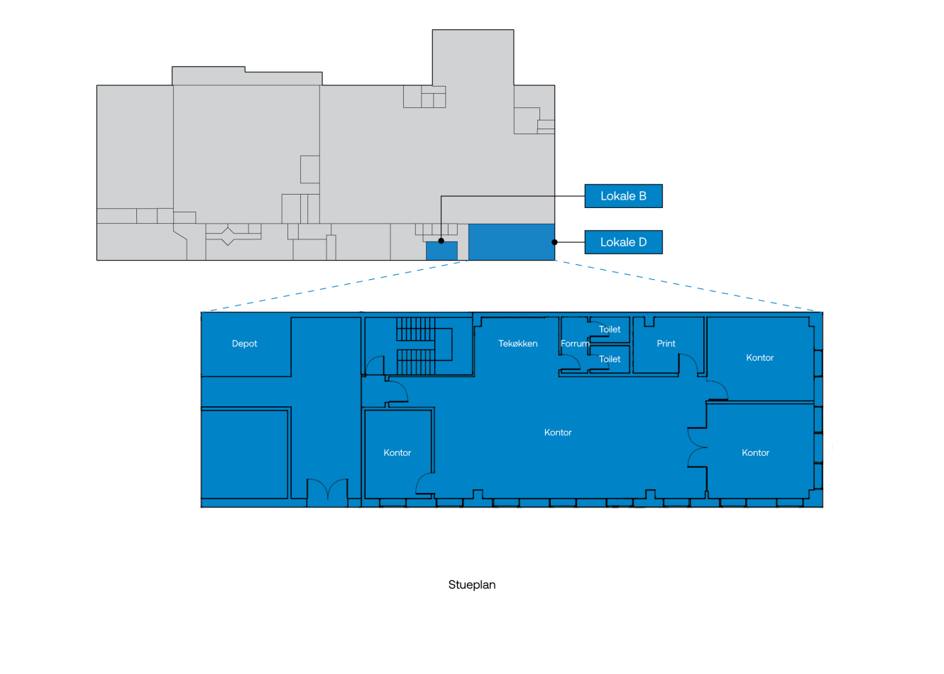 | Lokale B - kontor | m²:105 | Månedlig leje:8.313 kr. | Månedlige drifts- og varmeudgifter:1.969 kr. |