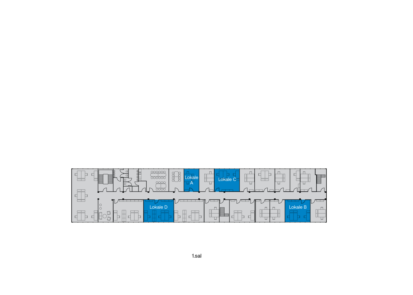 På 1.sal udbydes særdeles velholdte lokaler til kontorfællesskab med fleksible lejemuligheder. De mindste kontorer egner sig til 1-2 personer mens de større lokaler kan rumme op til 6 arbejdspladser. Der er mødefaciliteter, lounge, køkken og toiletter til rådighed som bruges i fællesskab med de øvrige lejere.