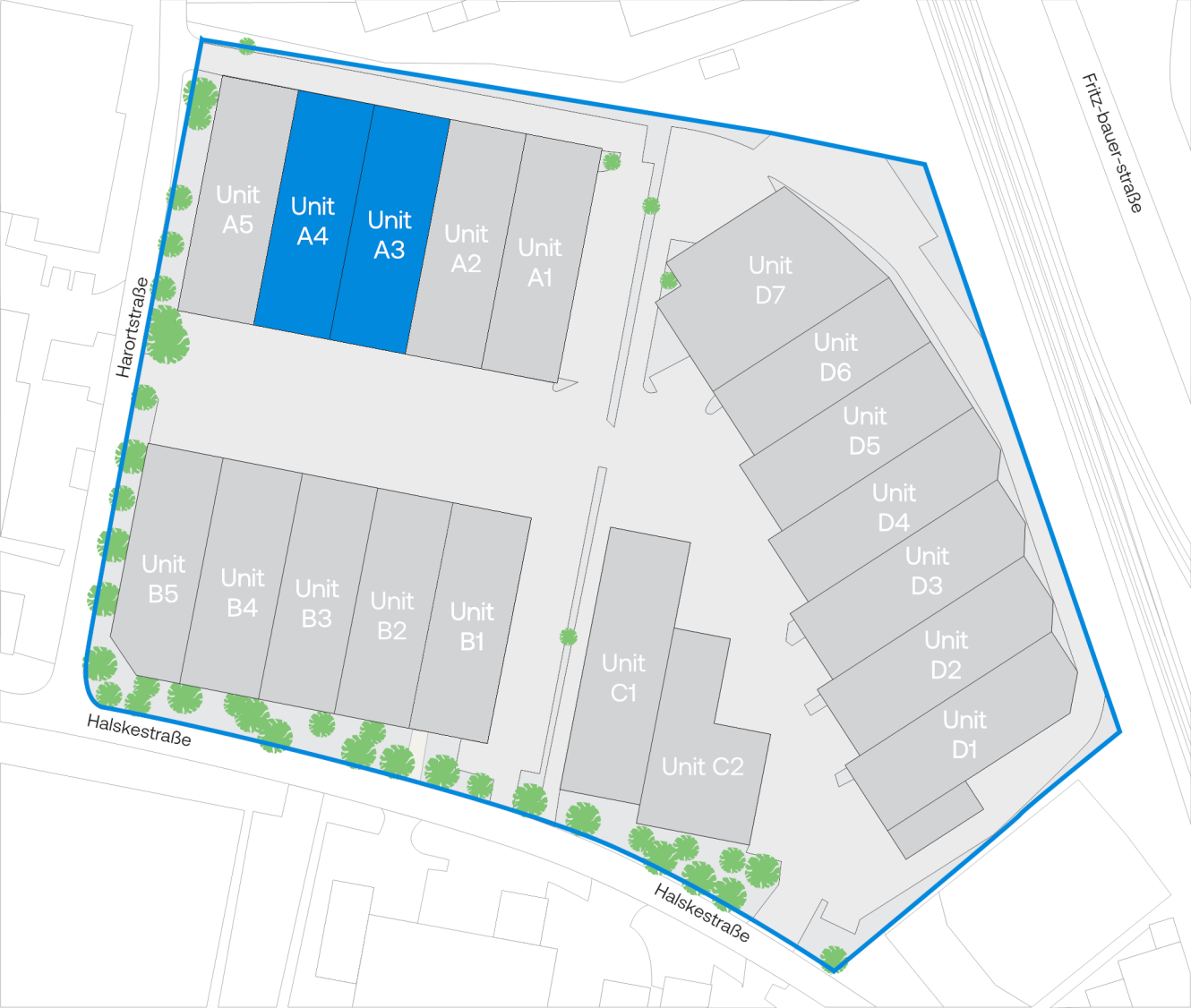 | A3 | Flächenart:Halle | Größe (m²):1.204 | Verfügbarkeit:01.08.2026 | Anmerkungen:inkl. 127 m² Büro in A4, zusammen vermietbar mit A4-A5 |