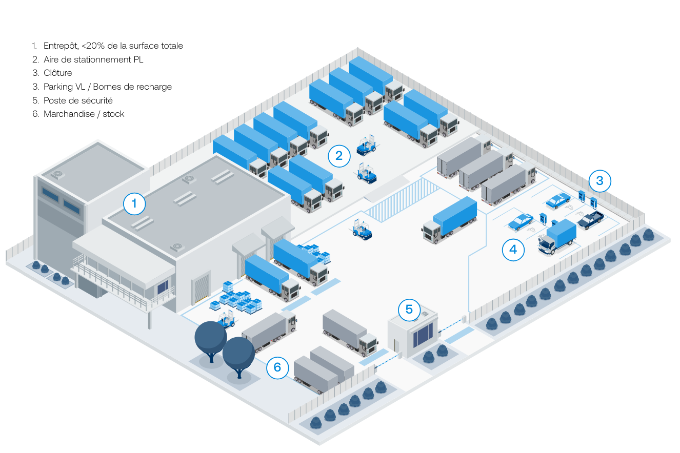 Les possibilités IOS sont nombreuses, elles vont des simples cours gravillonnées aux terrains de plusieurs hectares. Ces installations offrent diverses fonctionnalités telles que l’éclairage de sécurité, les clôtures sécurisées, la vidéosurveillance, l’accès contrôlé ou le gardiennage pour assurer la protection des biens et marchandises. Certains sites peuvent également proposer des bornes de recharge pour véhicules électriques, contribuant ainsi à répondre aux besoins ESG des entreprises. De plus, dans certains cas, une aire de stockage peut être combinée à un entrepôt ou des locaux d’activité, répondant ainsi à tous les besoins des locataires.