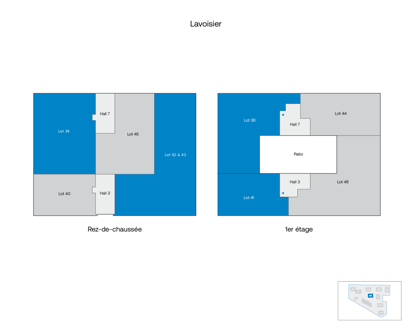 | Lot 42 & 43 | Typologie:Bureaux | Surface totale (m²):592 | Loyer HT/HC (€/m²):150 | Charges (€/m²):26,6 | Taxes (€/m²):- | Commentaires:Lot divisible Disponible après rénovation |