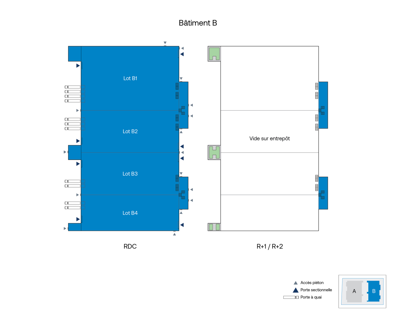 | Lot B1 | Typologie:Activités et bureaux | Surface totale (m²):5 077 | Loyer HT/HC (€/m²):105 | Charges (€/m²):- | Taxes (€/m²):- | Commentaires:Dont 483 m² de bureaux 1 porte sectionnelle 3 portes à quai |