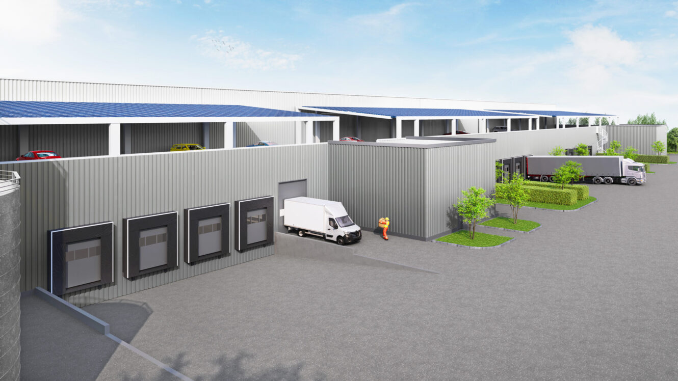 Les surfaces d’activité disposent d’une belle hauteur libre de 9,5 mètres et d’une resistance au sol de 5T/m². Chaque cellule est équipée d’au moins une porte sectionnelle, trois portes à quai et d’un éclairage 100% LED. Le chauffage-refroidissement des bureaux d’accompagnement se fait par une pompe à chaleur réversible.
