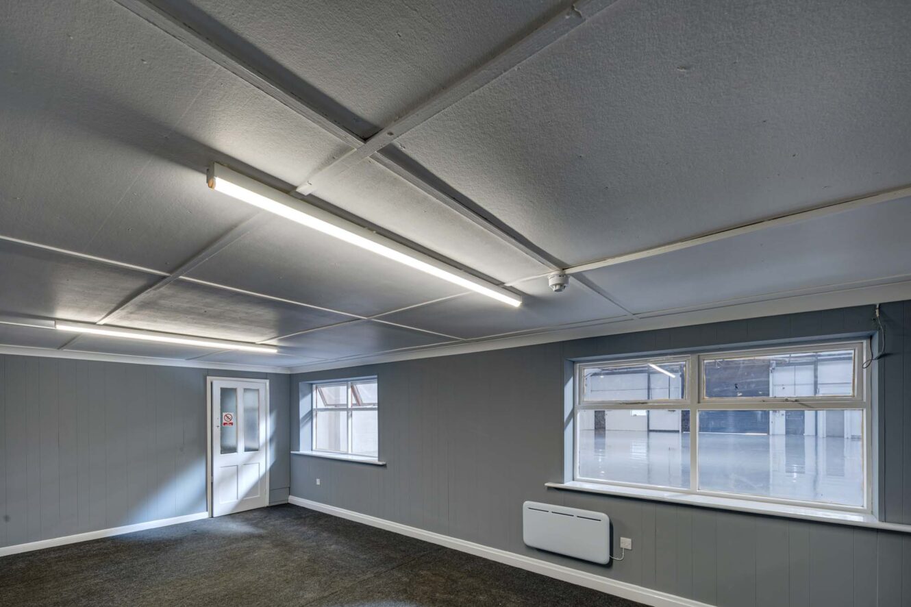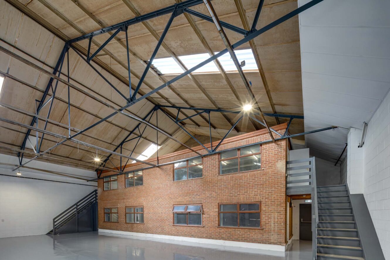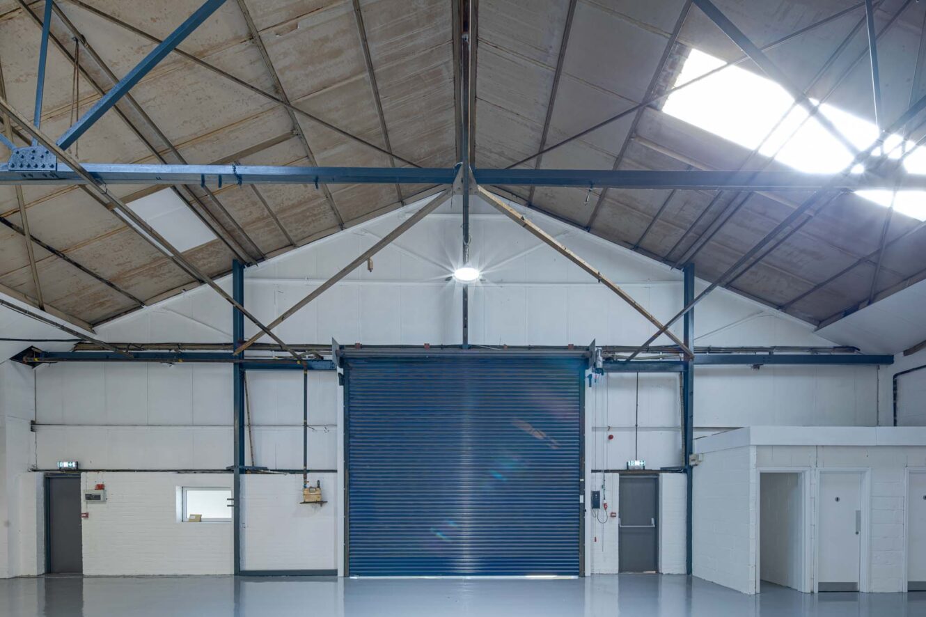 The units are equipped with LED lighting, roller shutter doors, pedestrian access doors, three-phase electricity, W/C, and kitchenette facilities. They offer a clear internal height of 4.72 meters.