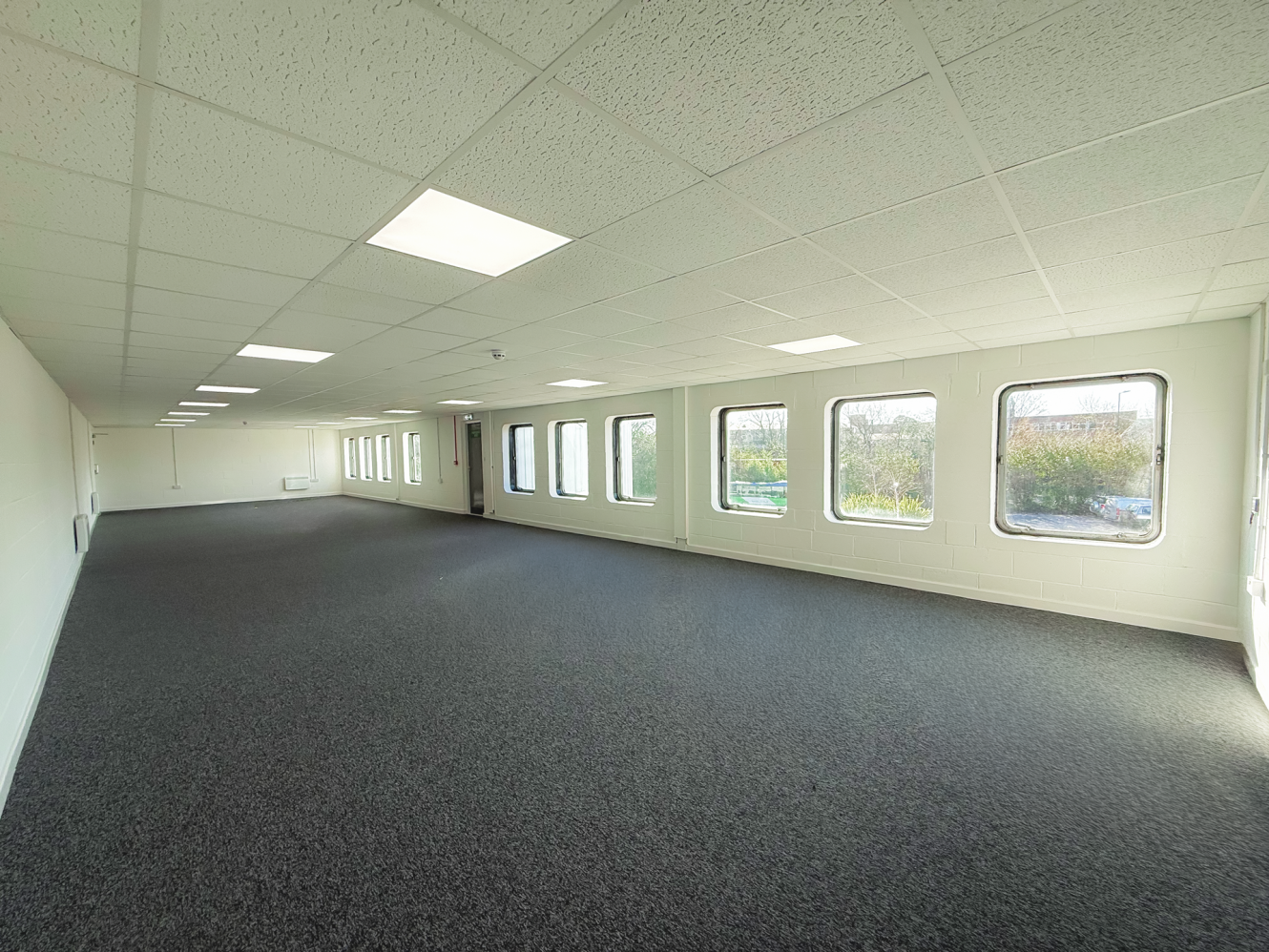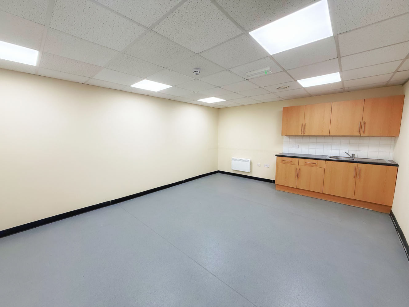 The mid-terrace unit is of steel portal frame construction, with elevations of profile cladding facing onto a loading area and main estate road. The building has been cosmetically refurbished and features a full height, level access loading door, concrete floor and warehouse LED lighting. The unit benefits from a trade counter entrance direct from the dedicated car parking area. Ancillary office, WC and kitchenette facilities feature within a single storey block. The rear elevation of the property provides any potential tenant with an excellent branding profile to Queens Drive.