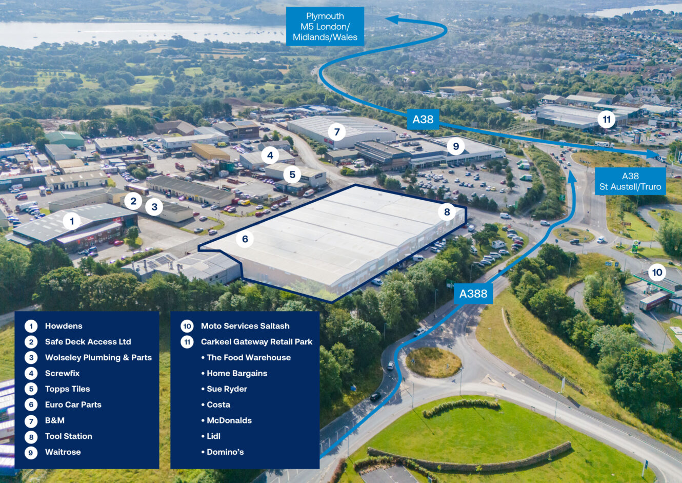 Saltash is located immediately to the west of Plymouth and is linked to the City via the Tamar Bridge and the A38 dual carriageway, which links Cornwall to Plymouth and Exeter and the M5 motorway. Tamar View Industrial Estate occupies an excellent location at the junction of the A38 dual carriageway with the A388, to Callington and Launceston. Situated off Avery Way, in a highly prominent position nearby occupiers include Waitrose Supermarket, Euro Car Parts, Toolstation, Screwfix and B&M.