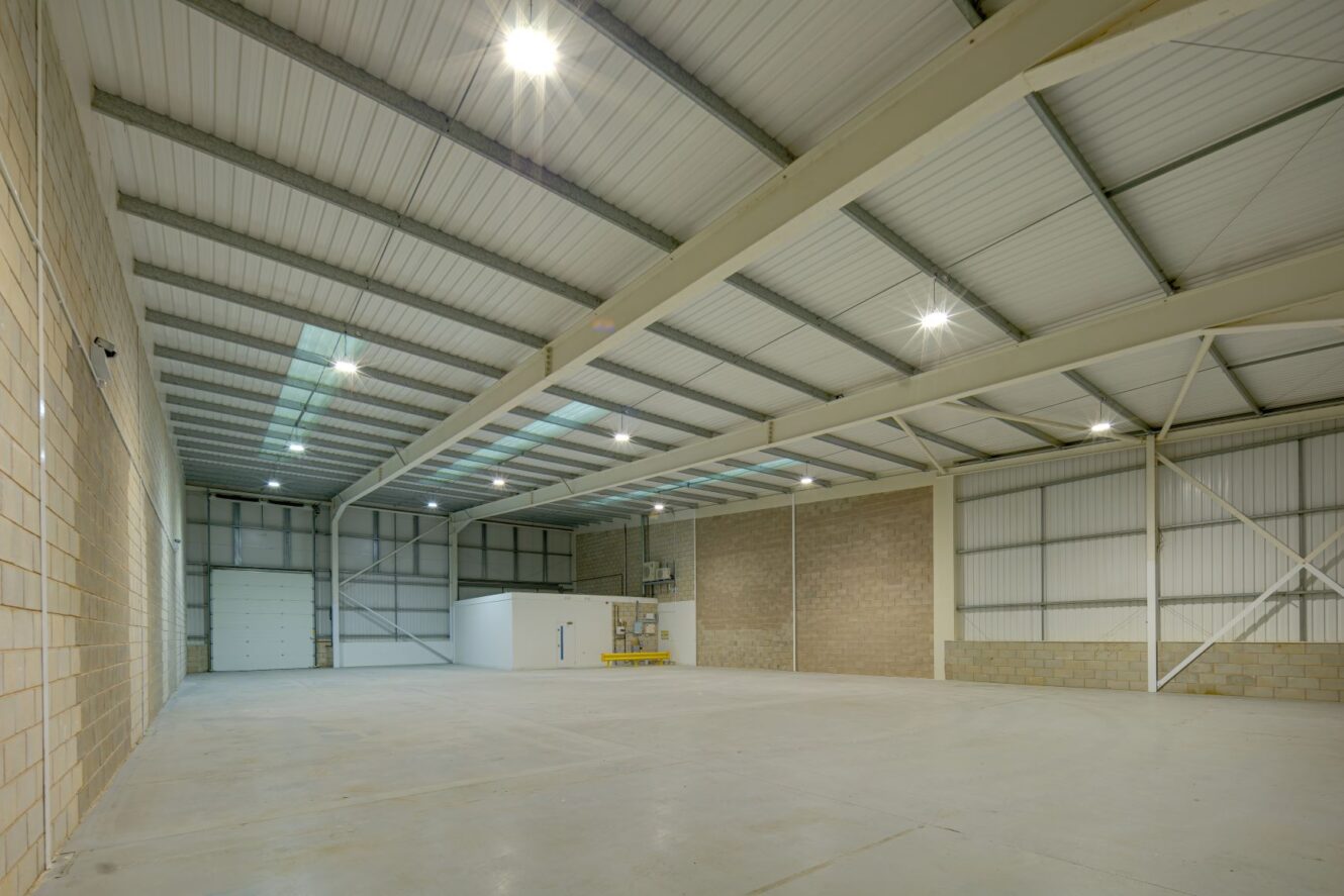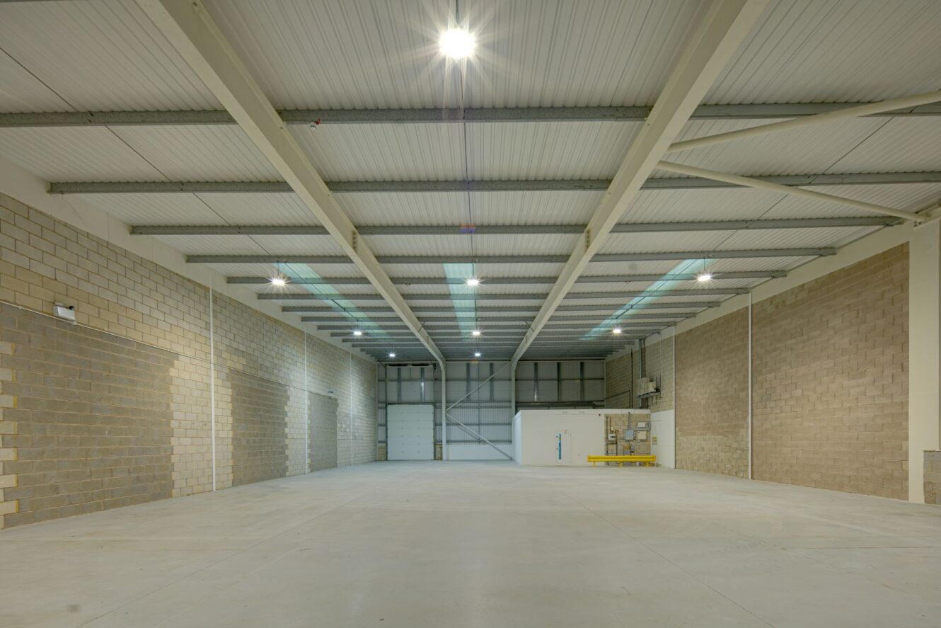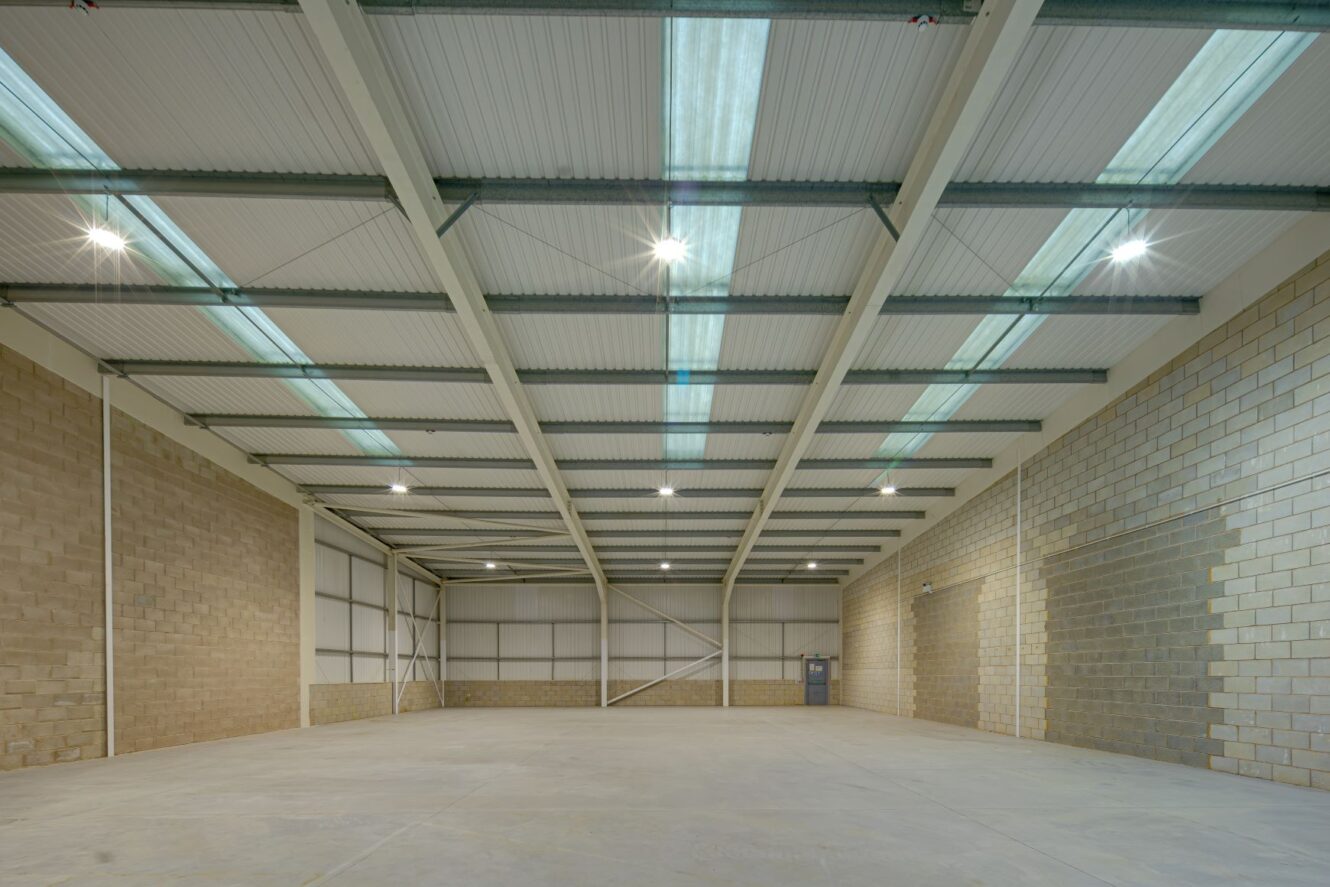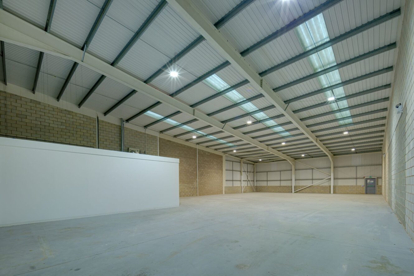 Gemini Trade Park is a modern industrial warehouse of steel portal frame construction, comprising block work to dado level with profile steel cladding above to the eaves. The roof is constructed of similar metal cladding, incorporating approximately 10% roof lights.