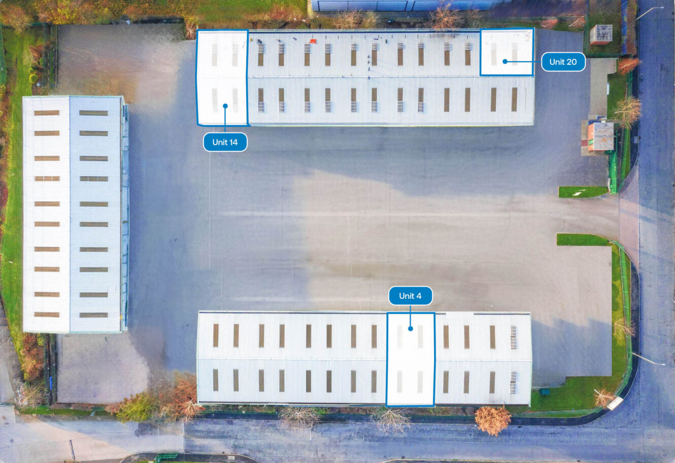 Unit 14 is a larger 2,367 sq ft. open plan industrial unit with an eaves height of 5.2 meters and benefits from a roller shutter door, LED lighting and three-phase power.