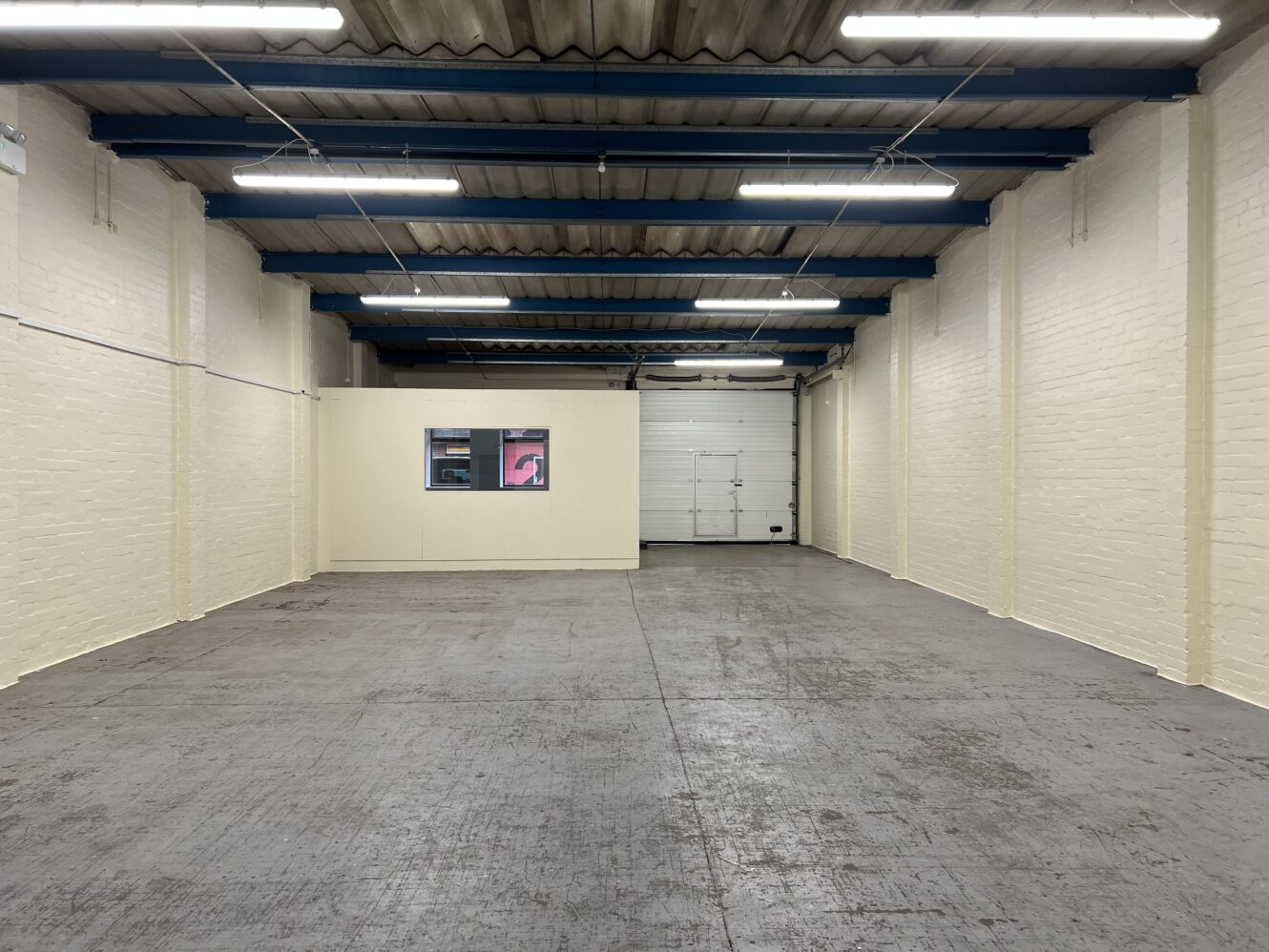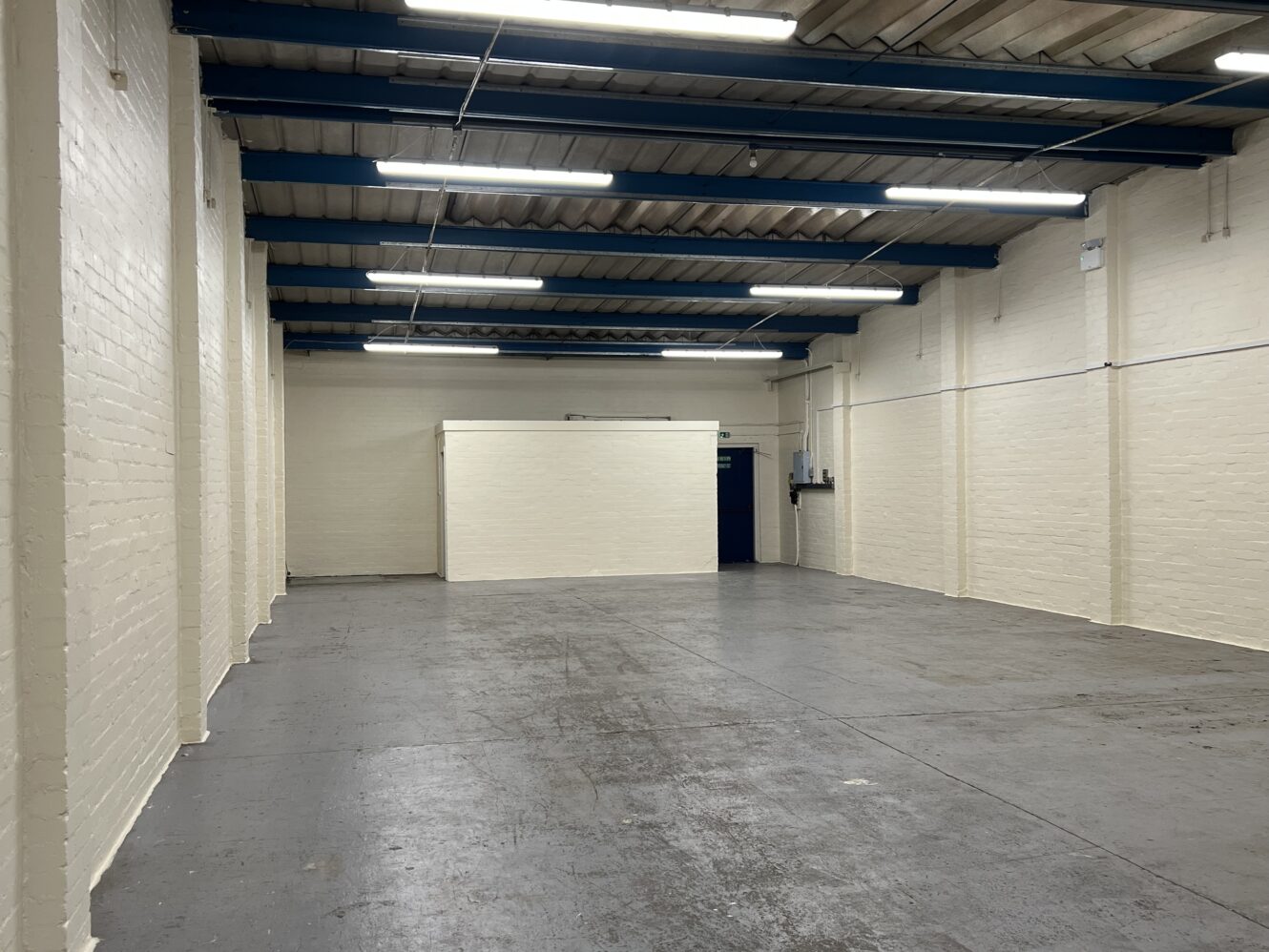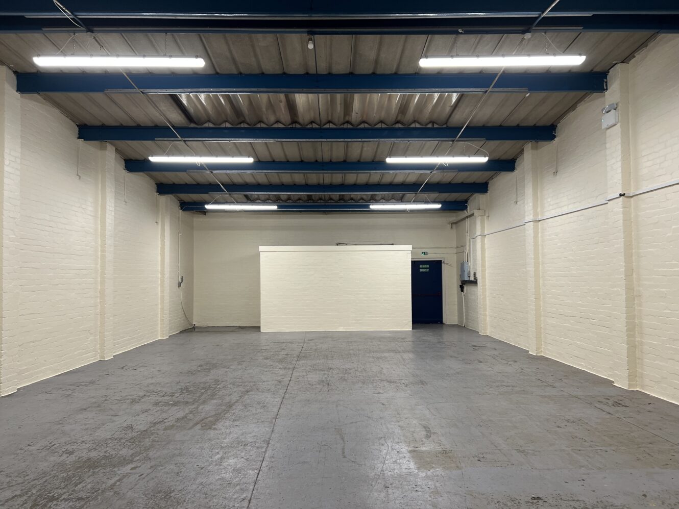 Industrial units constructed with a steel portal frame, featuring a roller shutter door, a minimum eaves height of 3.75m, welfare facilities, overhead roof lights, and a three-phase power supply.