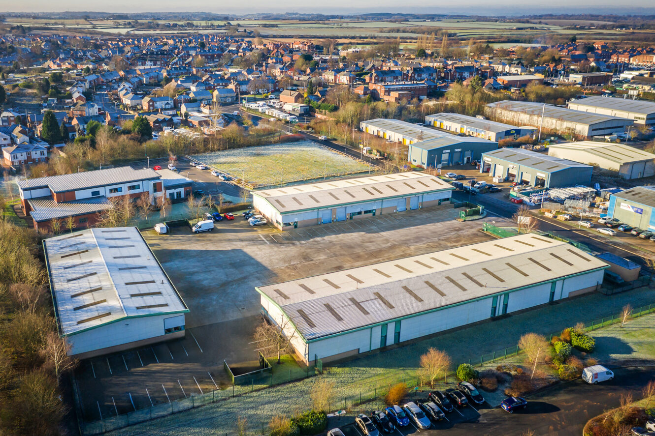 The property is of steel portal frame construction with part brick and part clad elevations beneath a pitched roof.