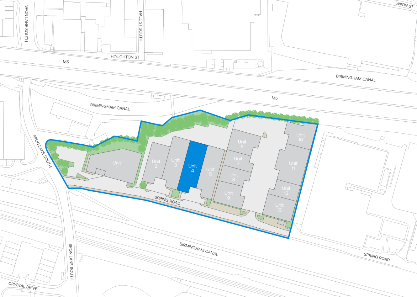 Spring Road Industrial Estate/Smethwick works is strategically located off the A4031 Spon Lane South, which links to the A4182 to the north and A457 Oldbury Road to the south. The estate is also 0.6 miles from Junction 1 of the M5. West Bromwich town centre and Oldbury town centre are approximately 1.5 miles and 2 miles distant respectively.