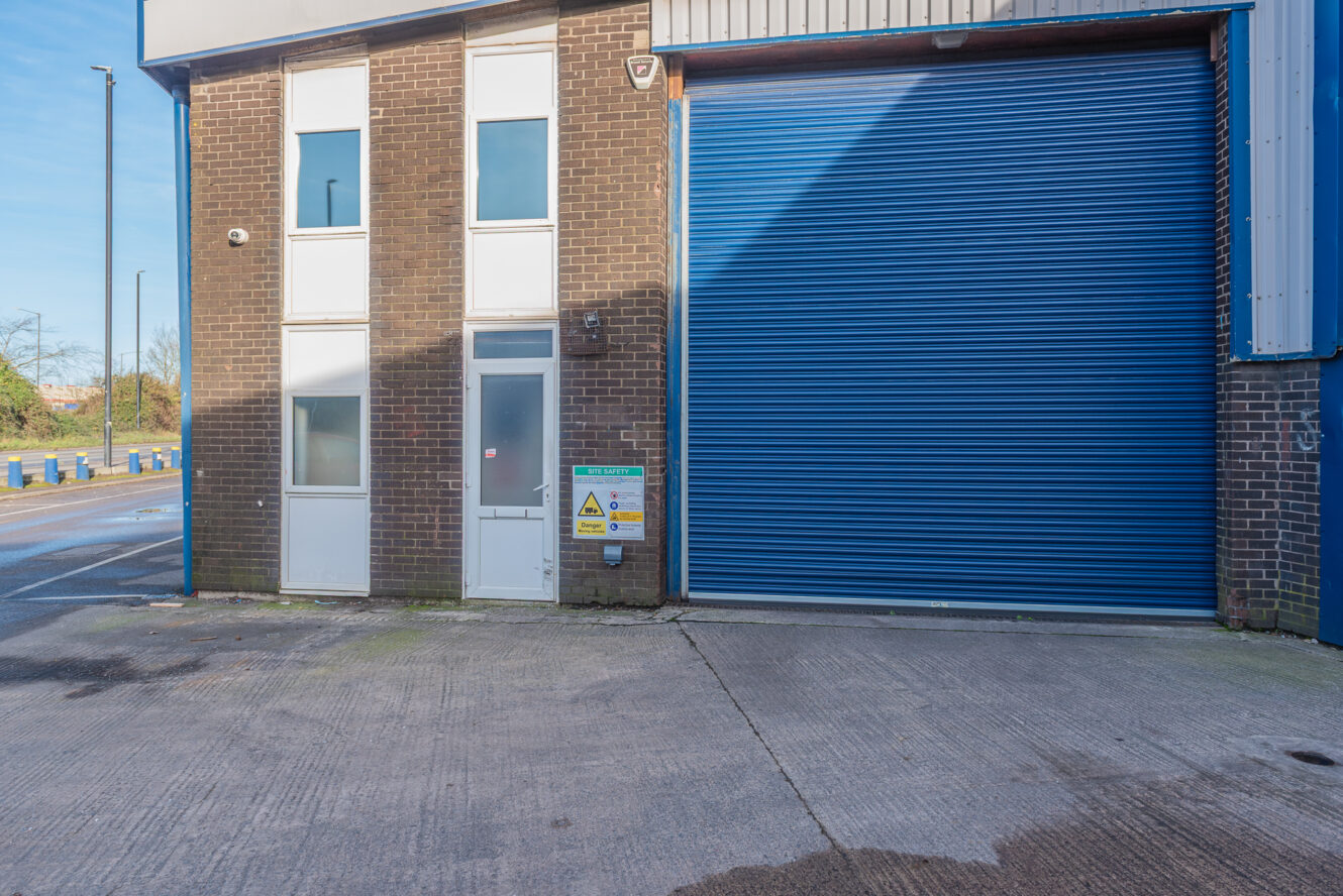 The property comprises a mid-terraced warehouse / industrial unit of steel portal frame construction with brick/block elevations. There is a pitched internally lined and recently over-clad roof with an eaves height of approximately 6m (19ft 8in). There are two full height roller shutter doors to the front of the building allowing loading and unloading. Internally, there is a small ground and first floor office/reception and kitchen.