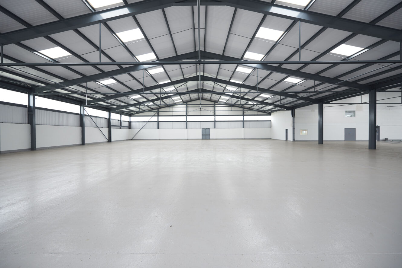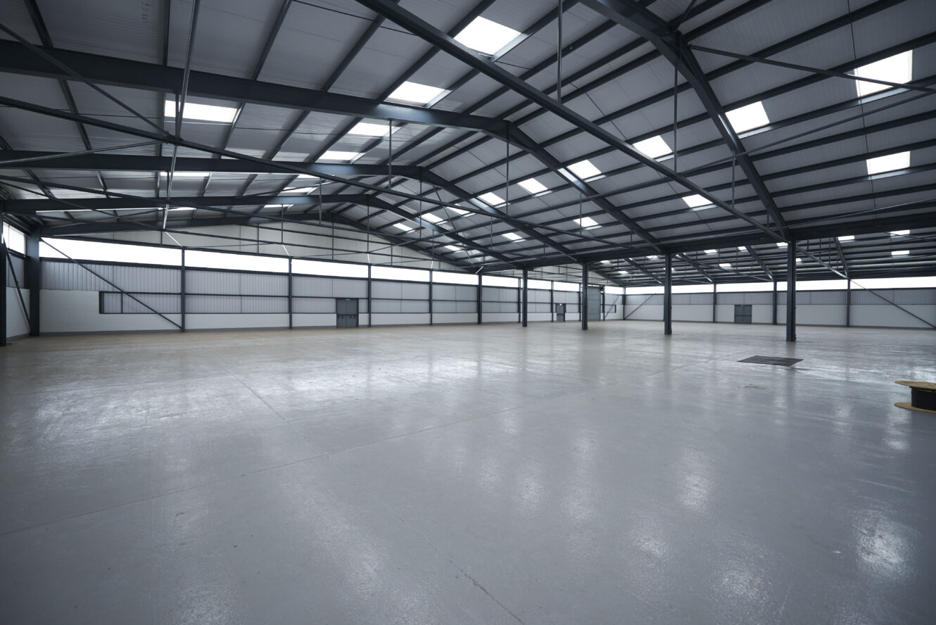 This detached industrial unit is constructed using a steel portal frame, with lower elevations finished in brick blockwork and upper elevations, including the pitched roof, clad in profiled steel sheeting. The warehouse benefits from natural light via translucent panels. The unit is accessed via roller shutter doors located on the side and rear elevations of the property. There is a secure yard suitable for loading and external storage.