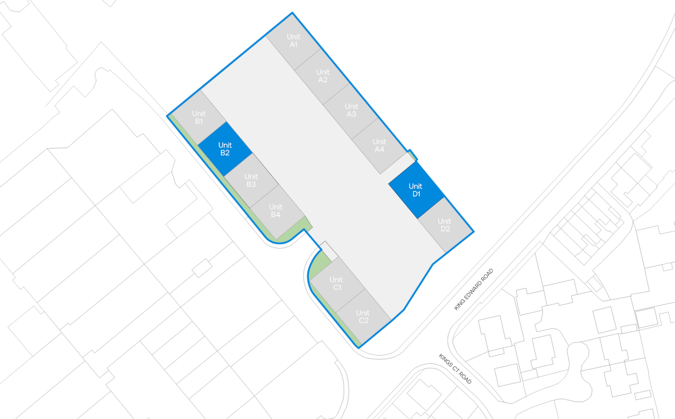 Units B2 and D1 each offer 2,500 sq. ft. of versatile industrial space, combining warehouse functionality with integrated office areas. All units benefit from 4.5m eaves height, 3.6m roller shutter doors, W/C facilities, and kitchenettes. Unit B2 provides a practical layout ideal for a range of industrial uses, while Unit D1 includes a front room suitable for reception or light office use, offering flexibility for various occupiers.