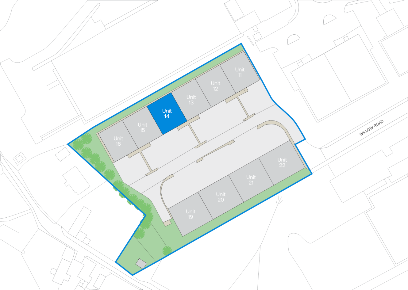Externally, unit 14 benefits from generous circulation space for loading and car parking.