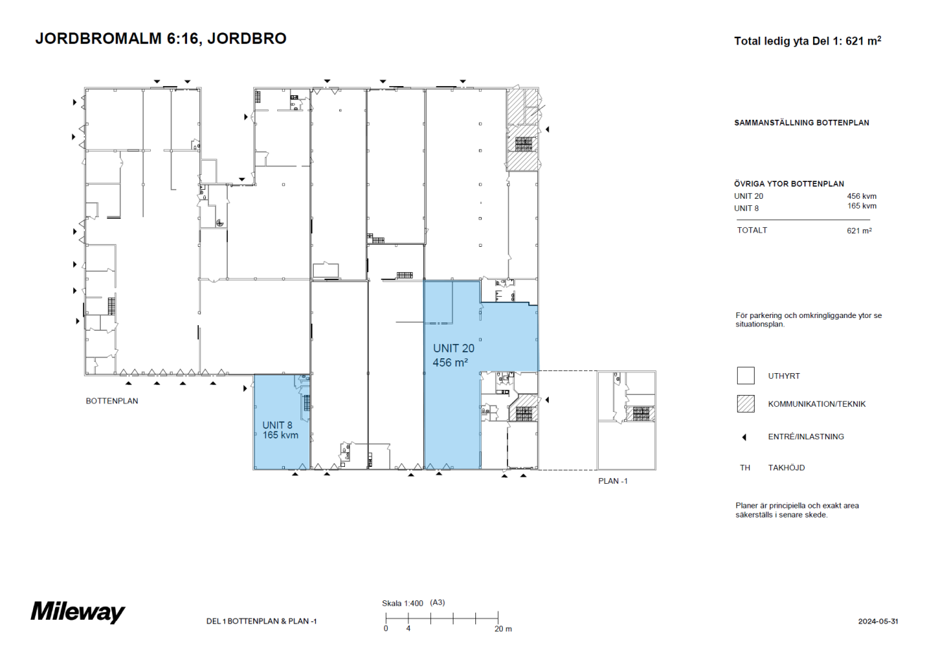 Unit 20: Lokal om cirka 456 kvm i markplan som för närvarande renoveras och kommer att färdigställas med nya ytskikt och LED-belysning. Lokalen får personalutrymmen med pentry, pausrum, omklädningsrum, WC och dusch samt ett kontorsrum. Taket är cirka 6 meter högt och in- och utlastning sker via en markport på cirka 4,5 meter. Uppställningsyta om 250 kvm finns utanför porten och tillhör lokalen.